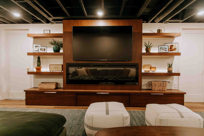 The design incorporated innovative solutions to maximize both aesthetic appeal and functionality. Custom cabinetry was a focal point, maintaining clean lines with flat paneled doors and a minimalist aesthetic. Thoughtfully placed lighting enhances the ambiance, creating an inviting atmosphere for relaxation and entertainment. These elements harmonize to create a cohesive and stylish environment that reflects the homeowner’s personality and lifestyle.