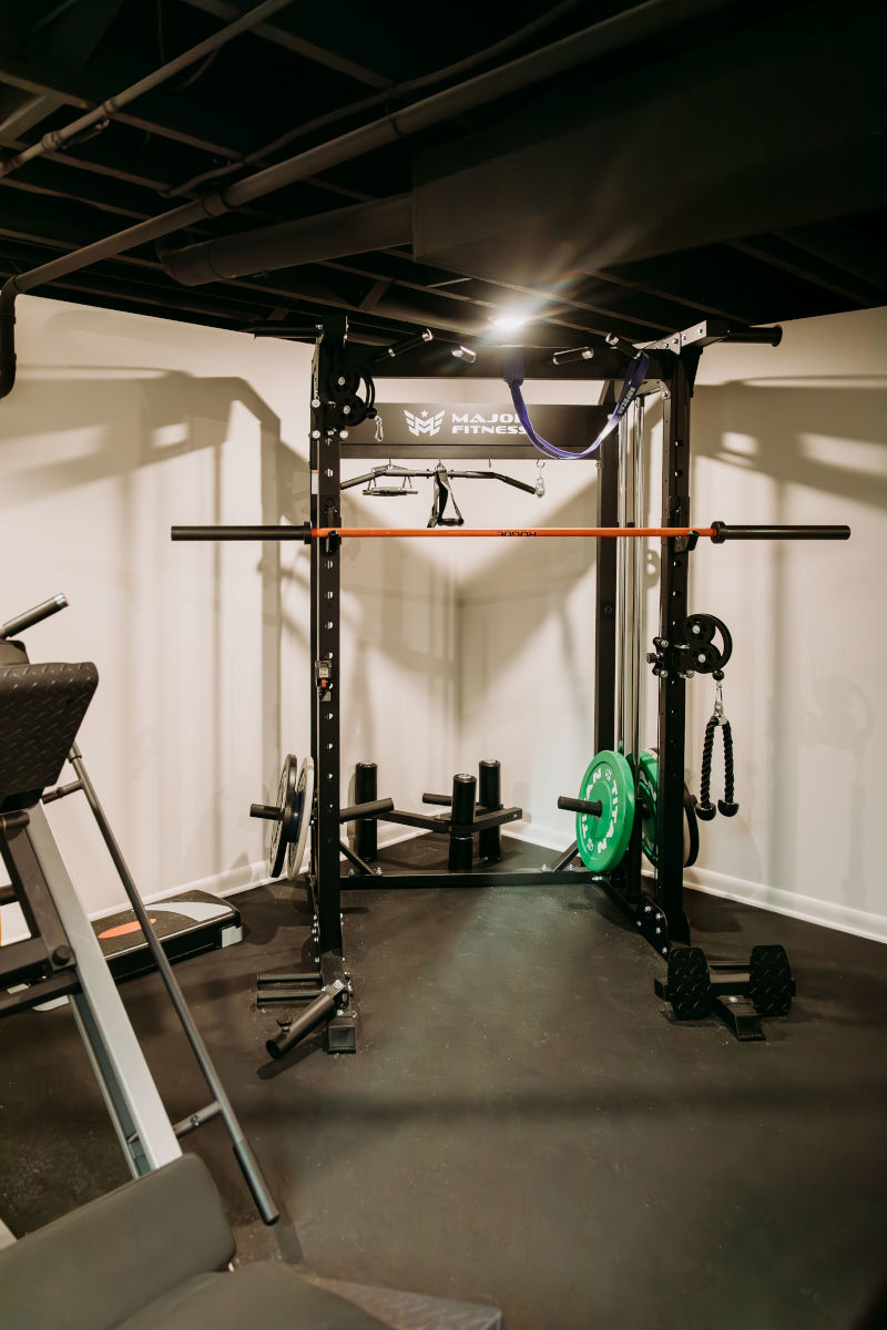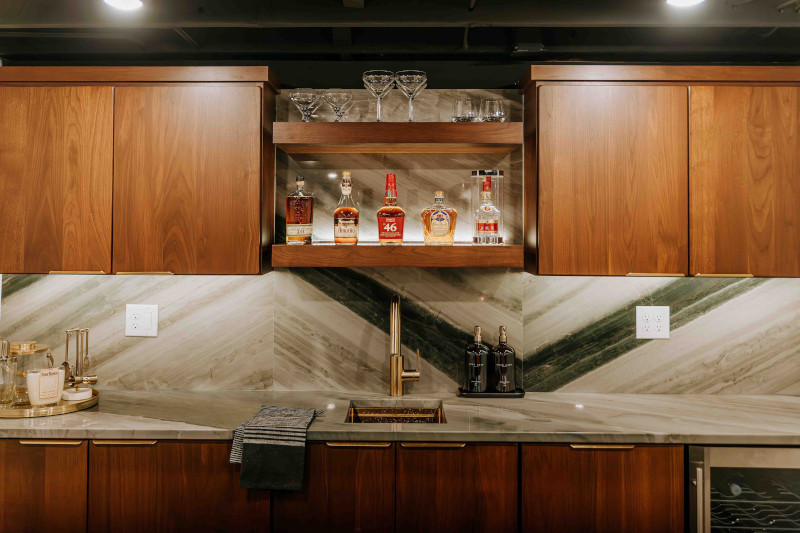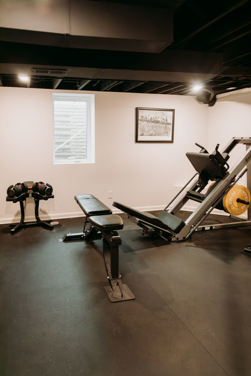 The renovation journey began in the basement, where the focus was on creating a space that accommodates both entertainment and wellness. The design team expertly crafted a custom entertainment area, complete with an elegant wet bar. The bar features custom cabinetry paired with a stunning quartz backsplash, offering a sophisticated backdrop for social gatherings. Another area in the basement contains a workout room with rubber flooring and its own bathroom for those daily workouts.