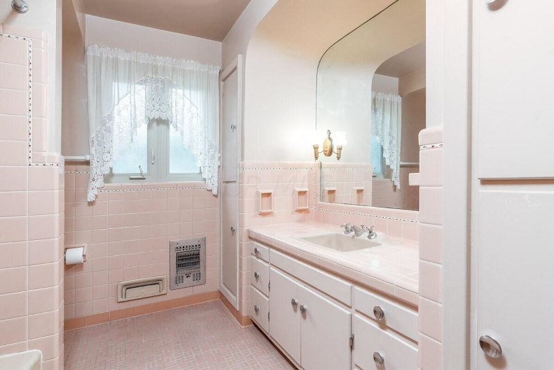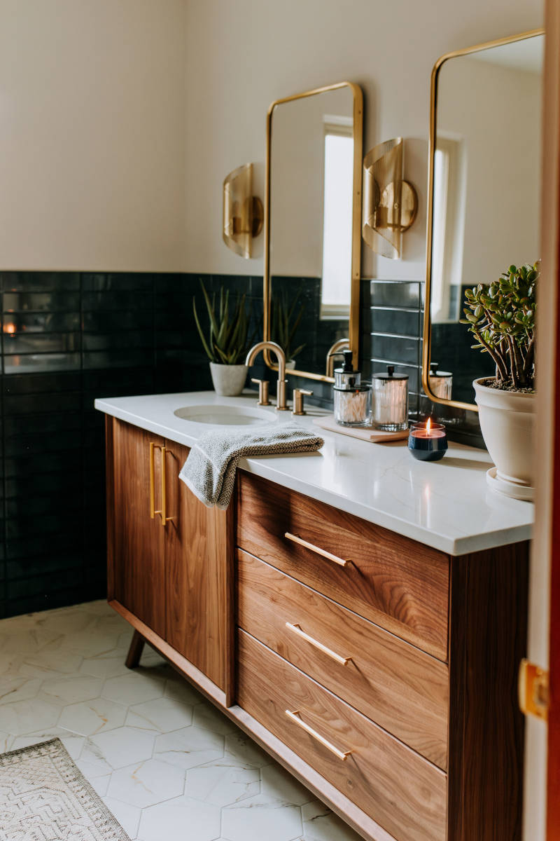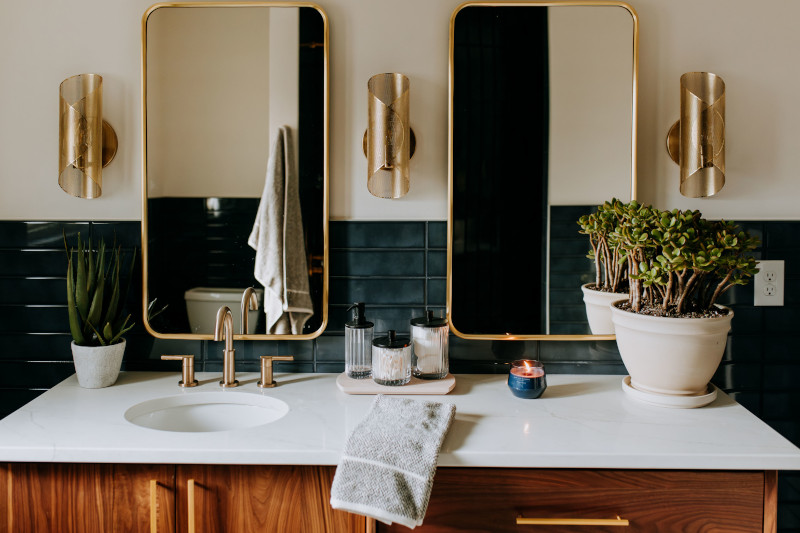 Upstairs, the dated bathroom got a complete makeover. The original pink tile was replaced with deep, dark, moody tile, immediately giving it a modern feel while staying true to its mid-century roots. The design incorporates dark accents with elegant fixtures, creating a spa-like experience.
