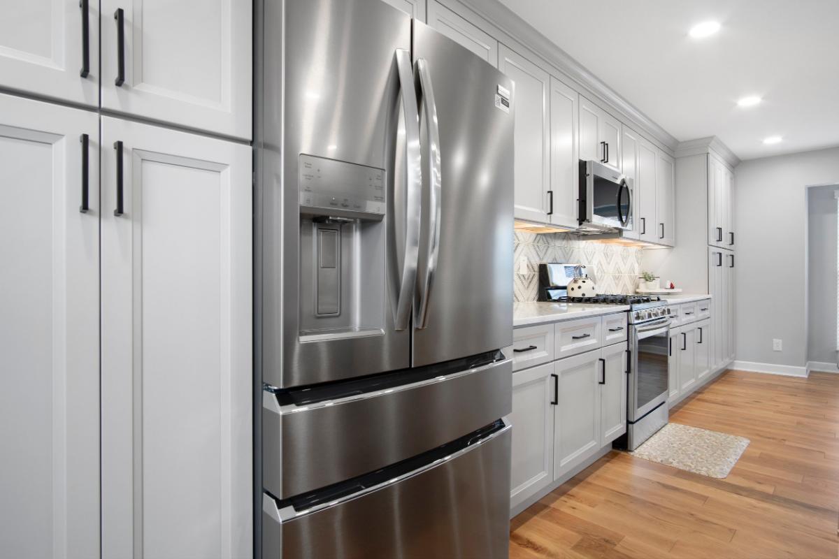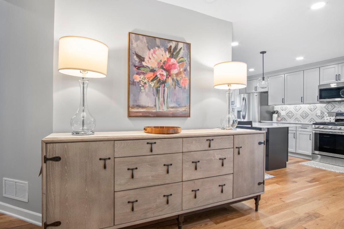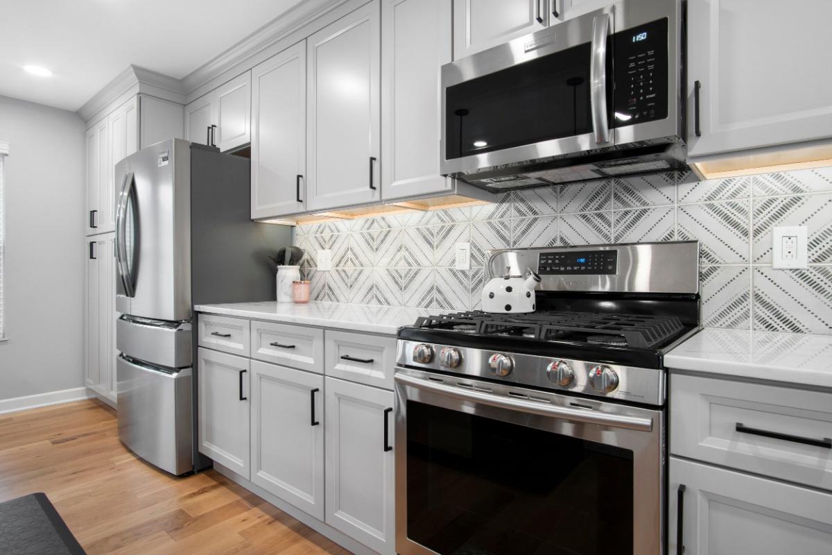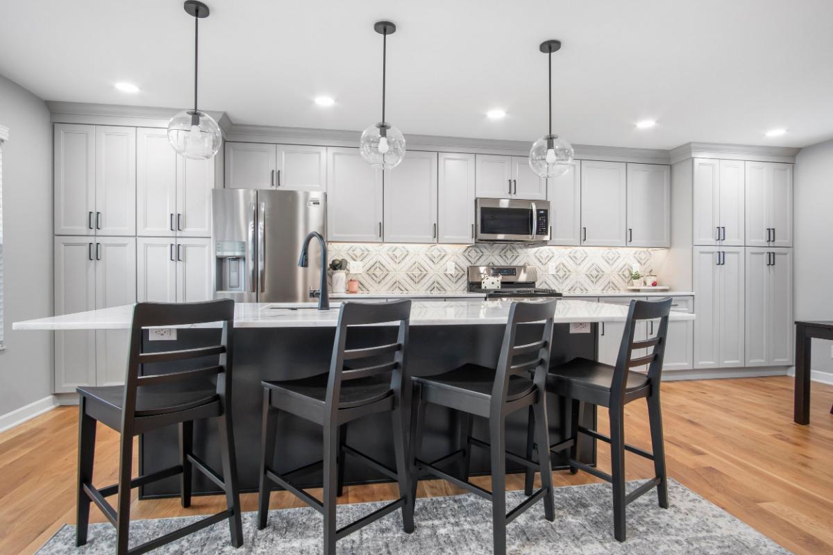 The kitchen, often referred to as the heart of the home, was reimagined with a contemporary aesthetic that exudes both warmth and elegance. The original enclosed kitchen area was opened up and replaced with a large island and generous cabinet space surrounding the work area. The choice of soft grey cabinetry provides a subtle contrast against the natural hardwood flooring. White quartz countertops reflect natural light, brightening the space, while the geometric-patterned backsplash adds a touch of sophisticated artistry. This design choice not only enhances the visual appeal but also offers durability and ease of maintenance.