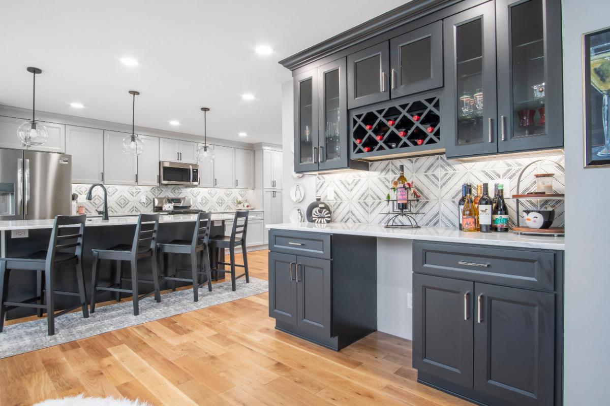 Attention to detail was paramount in this project. The kitchen is adorned with glass pendant lights that offer a minimalist yet chic touch, contributing to the open and airy feel. Under-cabinet lighting was also installed to illuminate the workspace, ensuring functionality is not sacrificed for form. The bar seating area invites casual dining experiences, while the inclusion of dark grey cabinetry in the wine bar area creates a visually striking element that anchors the room (wine cooler to be installed soon).
