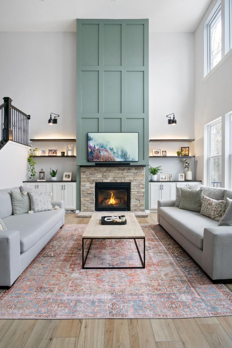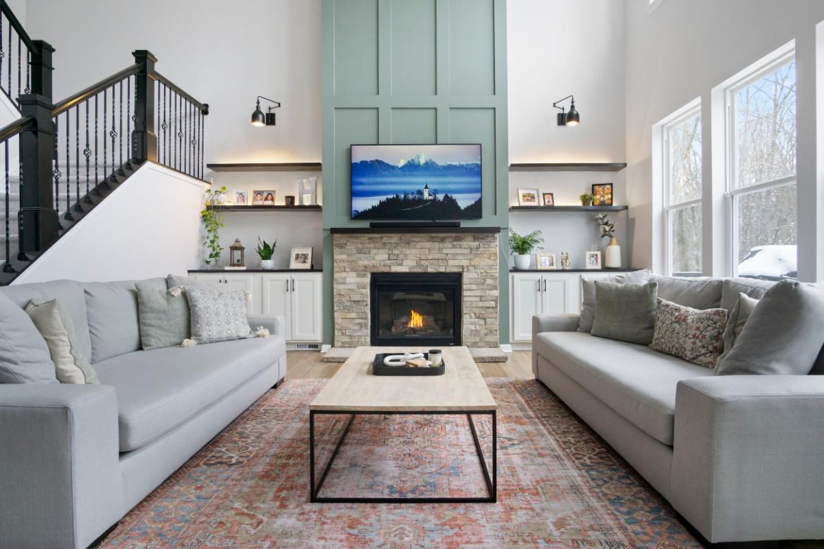 Our journey begins in the living room, where tranquility meets style. With a focus on open space and clean lines, we introduced a palette of soft greys and crisp whites. The custom-built, white cabinetry integrates seamlessly with the stone fireplace, creating a cozy yet sophisticated focal point. The luxury vinyl plank flooring offers the warmth of hardwood without the upkeep, ensuring durability and ease for our busy homeowners.