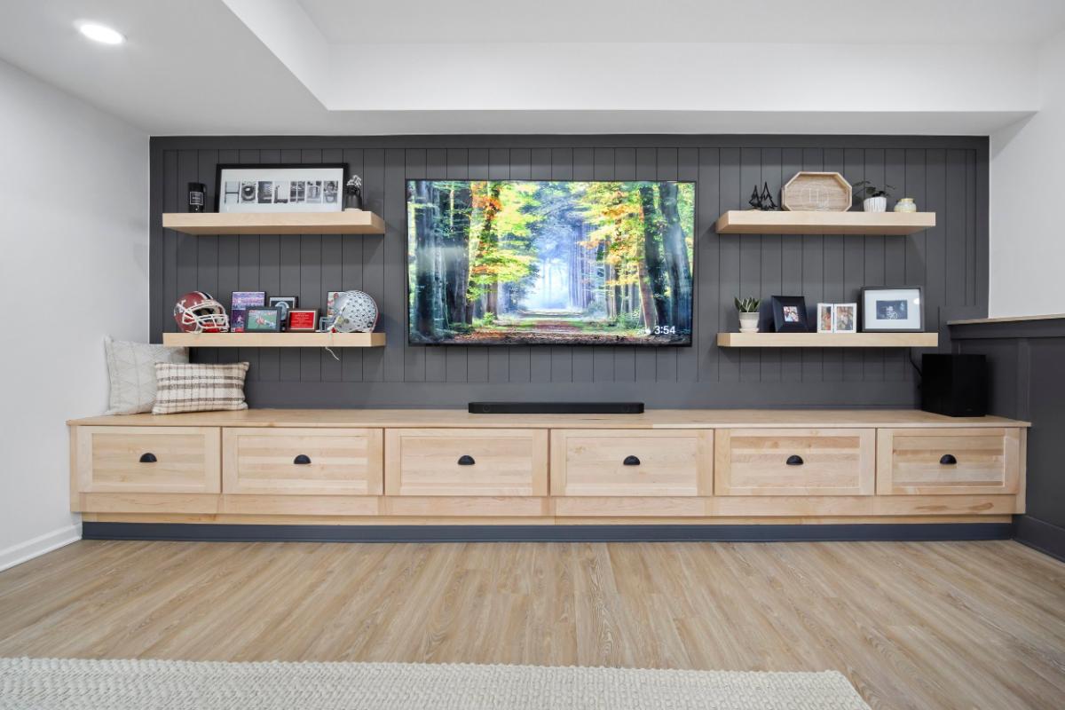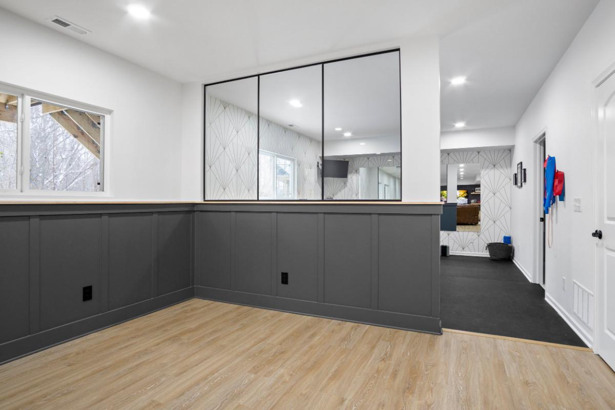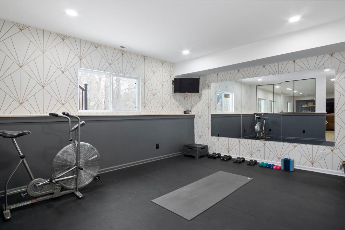 Descending to the basement, we’ve carved out an entertainment paradise. A custom wet bar beckons guests to indulge in a cocktail, while the adjacent area, featuring a wall-mounted TV and a natural wood media console, sets the stage for memorable movie nights. The space is rounded out with a fitness center, equipped with state-of-the-art gym essentials, all set against a backdrop of stylish wainscoting and mirrored walls to enhance the spacious feel.