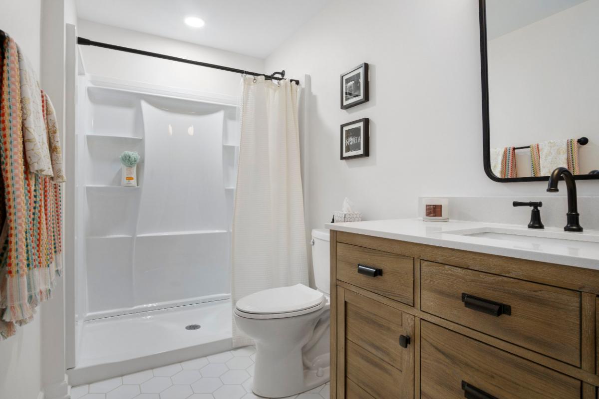 No remodel is complete without a bathroom transformation. We’ve installed a sleek shower unit and paired it with a timeless hexagon tile floor, adding an unexpected geometric flair. The wooden vanity, adorned with black fixtures, brings a touch of rustic charm, ensuring this space feels both modern and inviting.