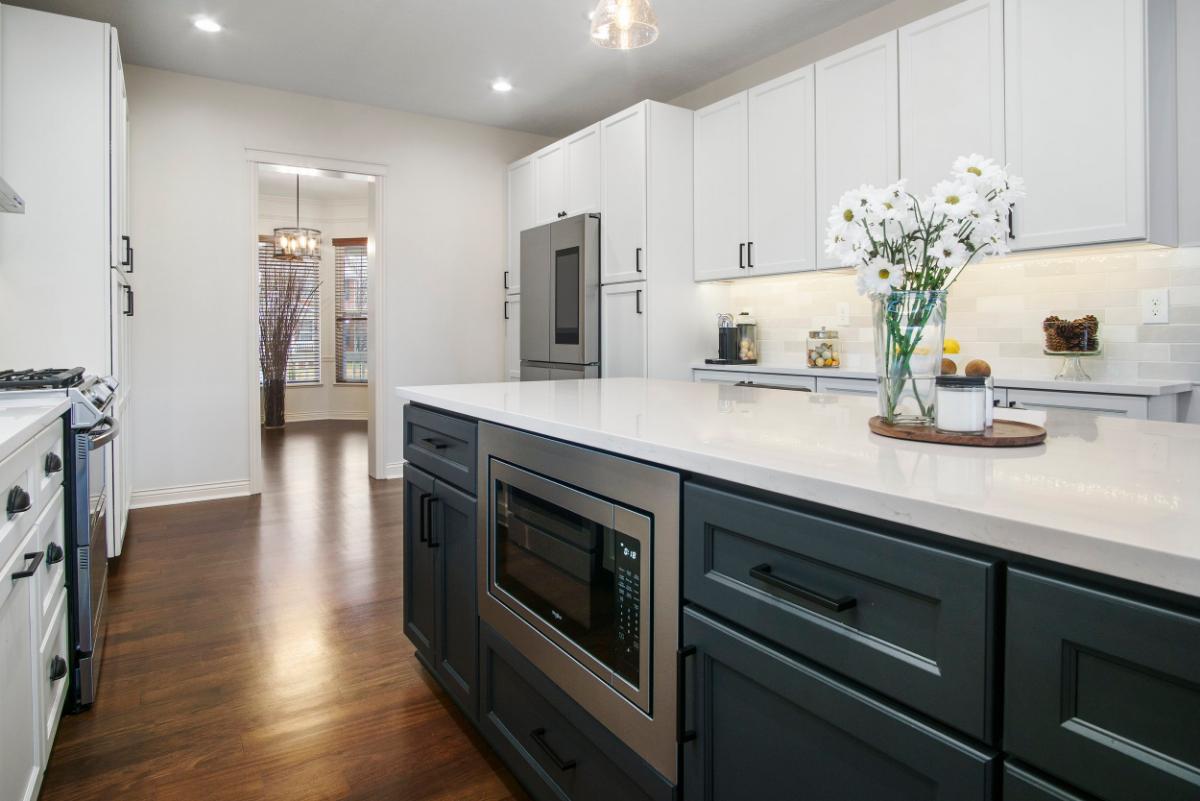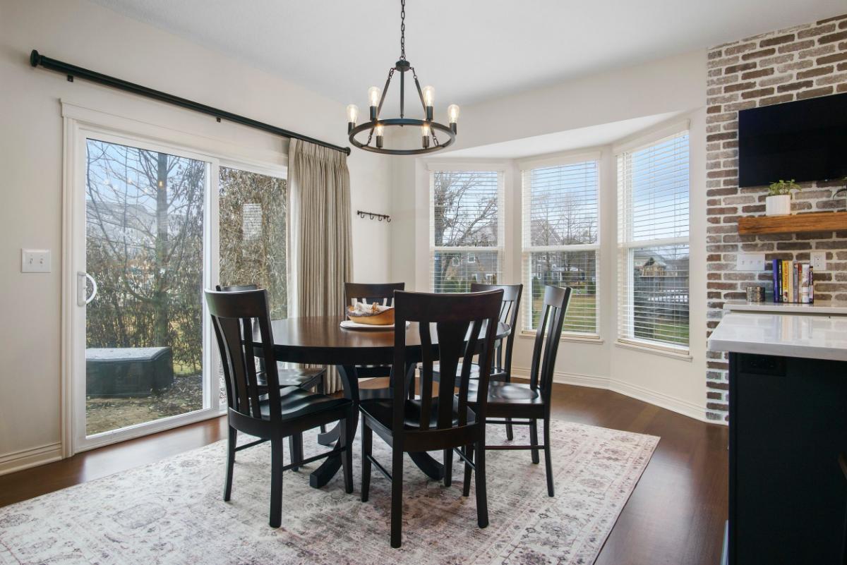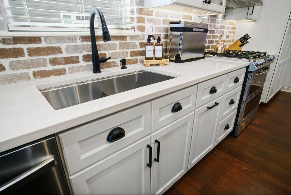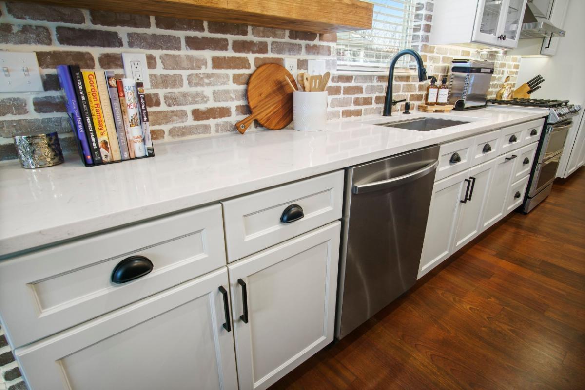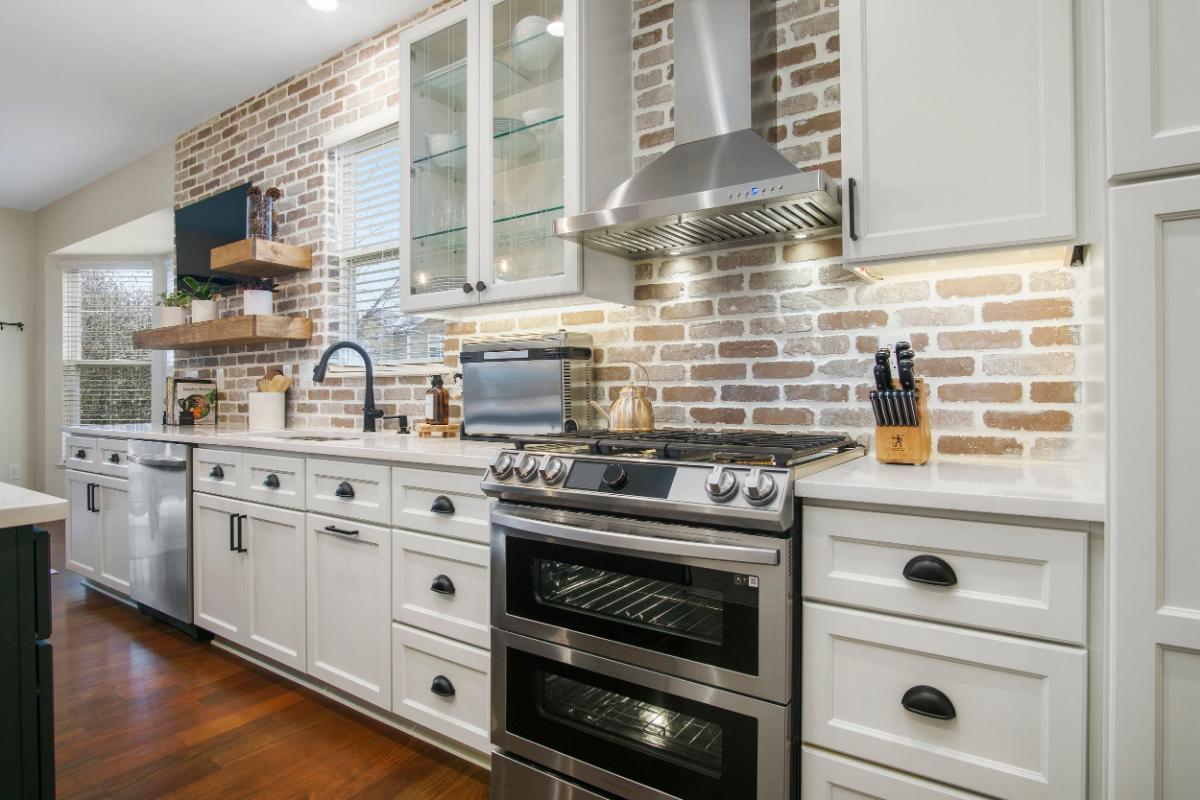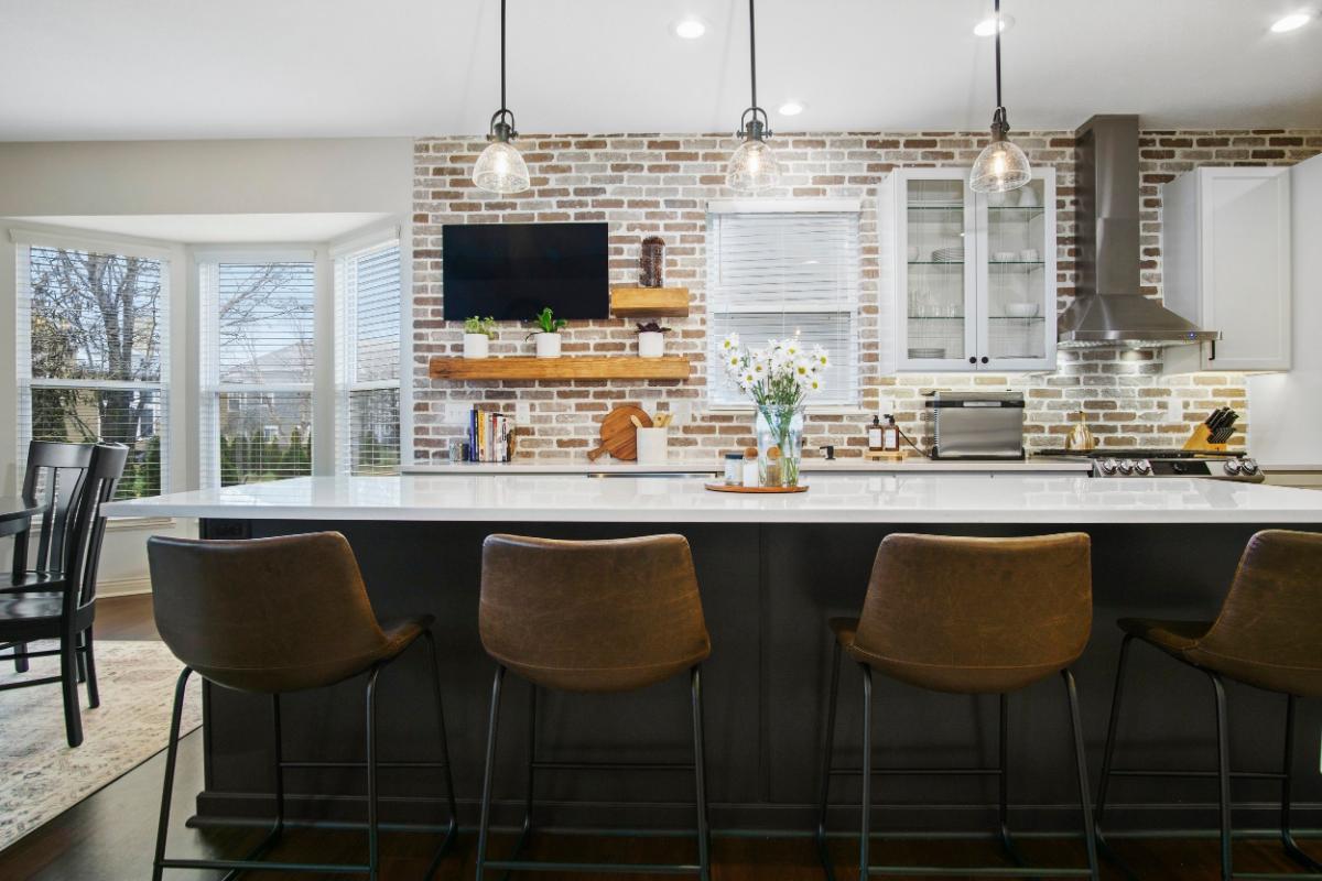 The design style of this kitchen can be described as “modern rustic.” The sleek, contemporary lines of the bar stools and countertop are complemented by the warmth and texture of the exposed brick wall, creating a harmonious blend of new and traditional elements.